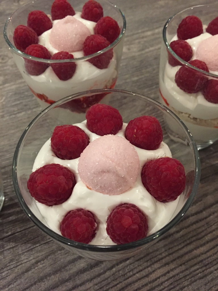 - Déposez une couche de meringue, puis une couche de crème, suivie d'une couche de framboises.